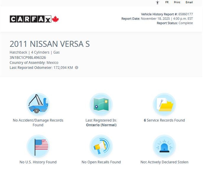 Very well maintained certified pre-owned 2011 Nissan Versa S Hatchback with 1.8L 4-cylinder engine and automatic transmission. Accident free and fuel efficient.
